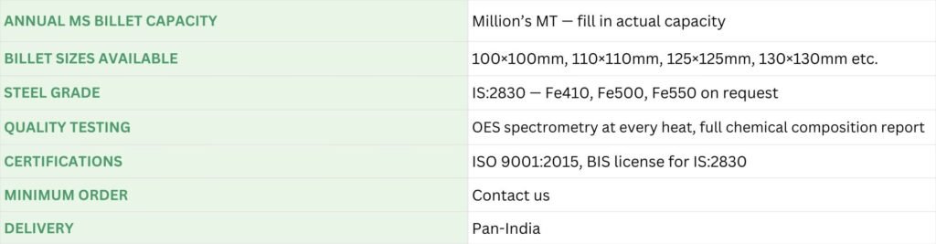 MS Billet & Steel Slab Manufacturing — IS:2830 Certified, Electric Arc Furnace